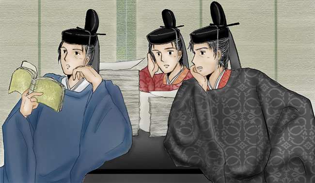 左から順に鹿深さん・八条さん・カモさん。朝廷の仕事場の一幕