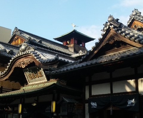 夏目漱石『坊ちゃん』の舞台にもなった明治時代の建築、道後温泉本館は、みやげ物店などが並ぶ温泉タイプ繁華街の真ん中の広場に、主人のように「デン」と座っている感じです。