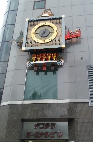 からくり時計が、高知駅に程近い「はりまや橋」の近くのビルにあり、此処でもショータイムを楽しませて頂きました(ちなみに今回は、何故か時間の都合で、神社仏閣よりも、「からくり時計」に縁がありました)。こちらの「からくり仕掛け」は、高知城、坂本竜馬、はりまや橋の二人、よさこい踊り五人娘、の四種類でした