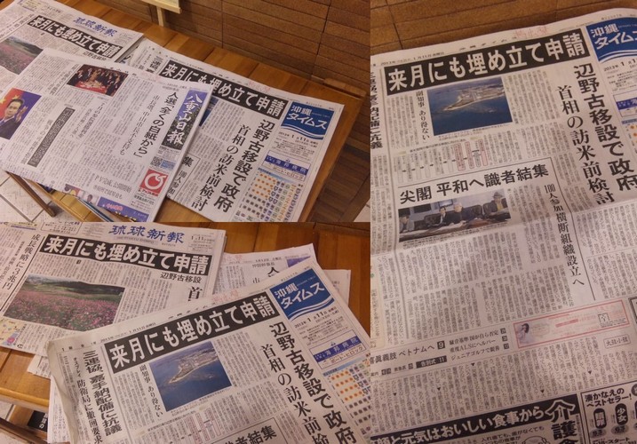 この写真は、1月11日の新聞の第一面を撮影してみたものです(時間が無かったので、これだけです)。「辺野古埋め立て&安倍首相の訪米の動向」が、第一面にありました。あとは、オスプレイ抗議の問題とか…