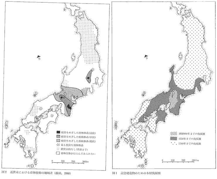 個別にどの山が、という話は難しいですが、コンラッド・タットマン『日本人はどのように森をつくってきたのか』(築地書館)は、古代・近世の森林伐採の状況について、たとえば桓武帝の森林利用に関する政策なども紹介しています。こんな図も載ってます。右は推定図ですけれども。