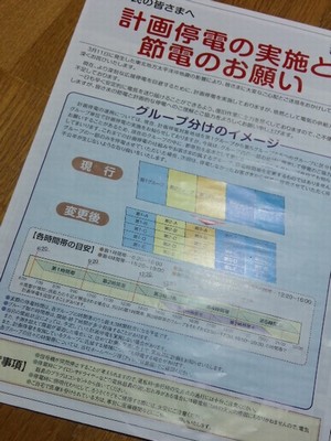 《2011.3.31メモ》計画停電のチラシを受け取りました。大きな5グループを細分化して5×5のグループ分けにするという内容で、地区ごとの細目グループ区分が、裏に印刷されてありました。