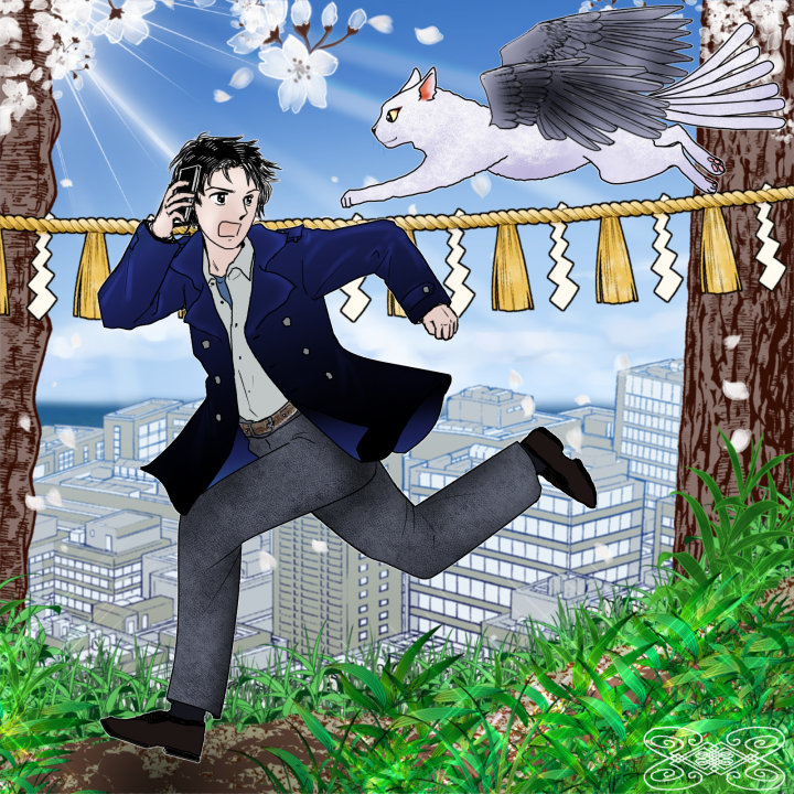 2025.04.25イラストお題「トレンチコート」:若き探偵・目暮啓司をイメージして。怪異なる相棒・猫天狗と共に走る場面。眼下に都会オフィスビル街をのぞむ春の野山。ちなみに、この春の野山は、クスタマ神社の境内の設定。現代日本コメディ風